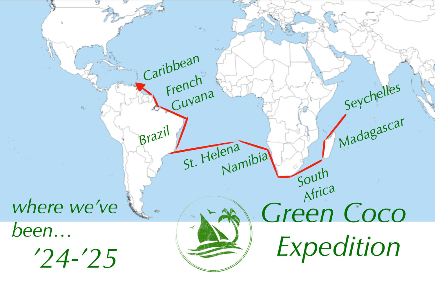 The Green Coco Expedition is going around the world, hosting families & adventurous travelers, aboard the 60ft catamaran Nesi.We are an adventure cooperative, a private membership organization.Interested in joining? Send us a message. 2024: Seychelles, Madagascar, South Africa, Namibia COMPLETED!
